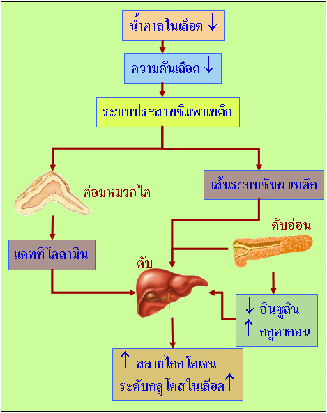 ถ้าระดับน้ำตาลในเลือดต่ำ จะกระตุ้นการทำงานของระบบประสาทซิมพาเทติก
