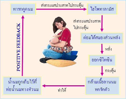 ซึ่งการที่ทารกดูดนมมารดาอยู่สม่ำเสมอ จะเป็นการกระตุ้นให้ต่อมไต้สมองสร้างฮอร์โมนออกซิโทซินตลอดเวลาหรือมากขึ้น