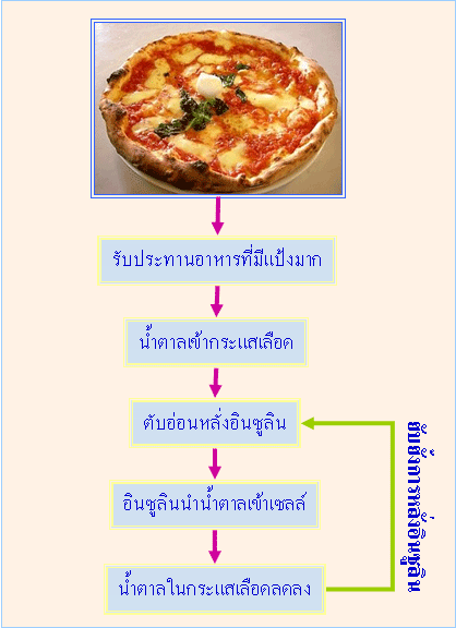 เมื่อระดับของกลูโคสในกระแสเลือดมาก ตับอ่อนจะผลิตฮอร์โมนอินซูลินออกมา