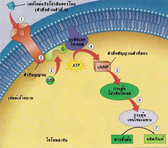 (first messenger) เมื่อฮอร์โมน จับกับตัวรับสัญญาณ ที่จำเพาะ ที่ยื่นออกมาด้านนอกของเยื่อหุ้มเซลล์