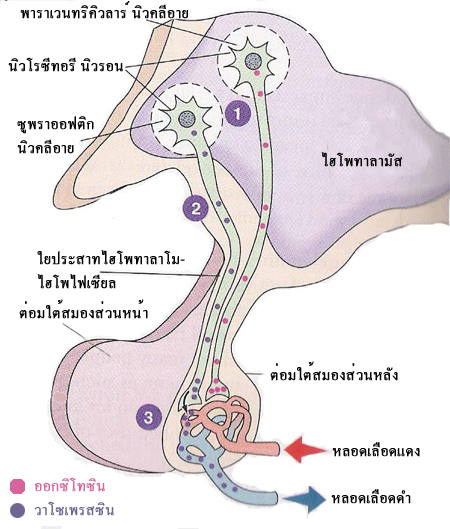 2 ฮอร์โมนจะเคลื่อนที่ตามเส้นประสาทแอกซอนมาเก็บไว้ที่ต่อมใต้สมองส่วนหลัง
