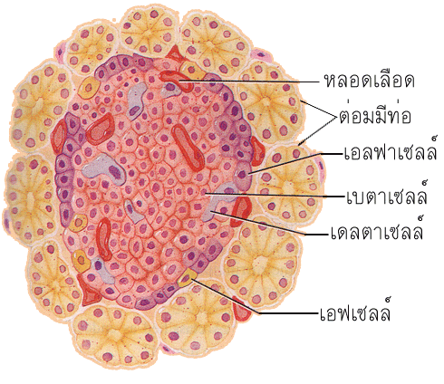 แสดงกลุ่มเซลล์ในหนึ่งไอเลตออฟแลงเกอร์ฮานส์ของตับอ่อนเช่น