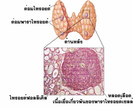 ที่ด้านบนและด้านล่างของต่อมไทรอยด์ มีขนาดเล็กมีอยู่ 4 ต่อม