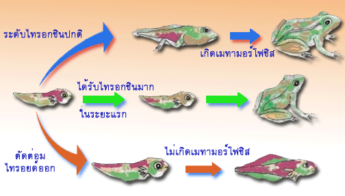 เช่น กบ จะเจริญจากลูกอ็อดเจริญไปเป็นกบโตเต็มวัยได้ตามปกติ ถ้าขาดฮอร์โมนไทรอกซินจะทำให้ลูกอ็อดไม่เปลี่ยนแปลงรูปร่างกลายเป็นกบโตเต็มวัยหรือถ้ามีมากเกินไปก็จะเจริญไปเป็นกบอย่างรวดเร็ว