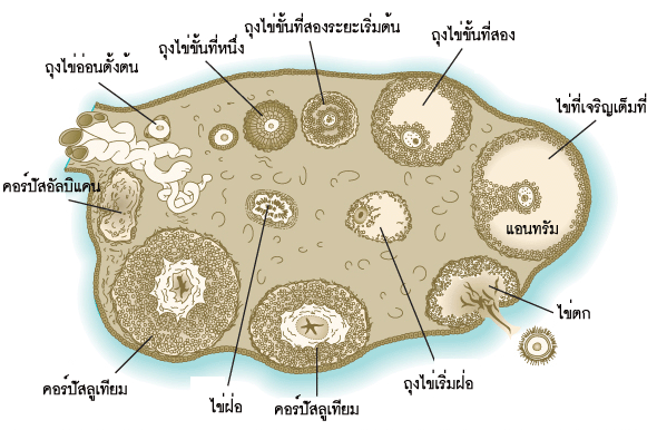 3. ไข่ที่เจริญจะผลิตฮอร์โมนอีสโทรเจนและโพรเจสเทอโรนออก