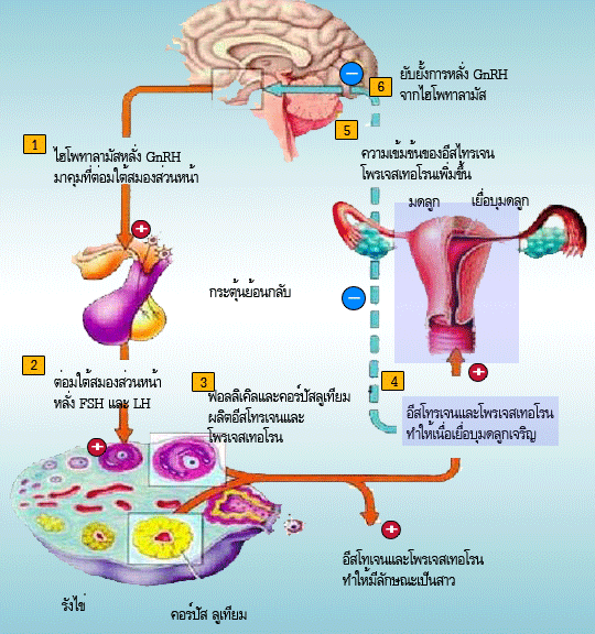 ปริมาณของอีสโทรเจนและโพรเจสเทอโรนที่เพิ่มขึ้นจะไปยับยั้งไฮโพทาลามัสให้ลดการหลั่ง