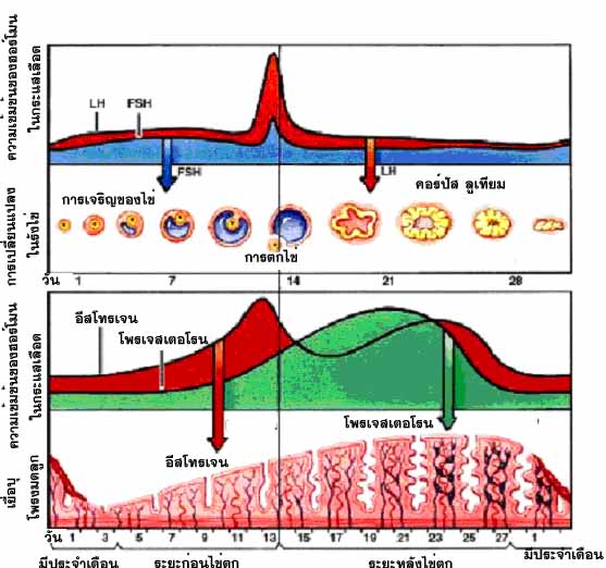 ระดับของฮอร์โมนอีสโทรเจนและโพรเจสเทอโรนที่มีผลต่อการเจริญของเยื่อบุมดลูกและรอบประจำเดือน