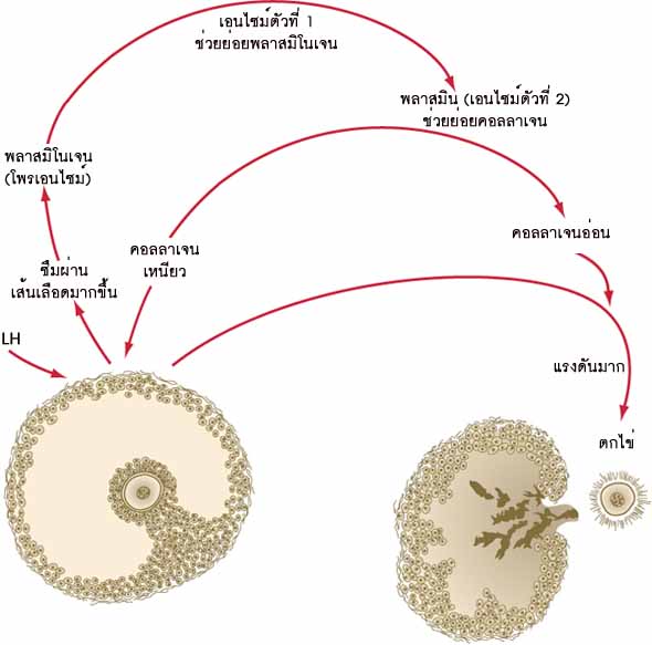 และพลาสมินจะเป็นเอนไซม์อีกตัวหนึ่งช่วยย่อย คอลลาเจนในถุงไข่อ่อน