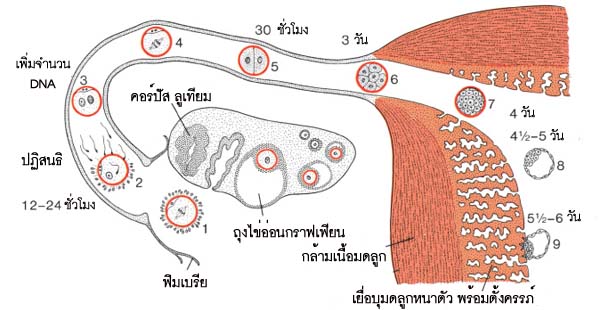 การปฏิสนธิ การแบ่งเซลล์ และการฝังตัวของตัวอ่อนที่โพรงมดลูกซึ่งใช้เวลาประมาณ