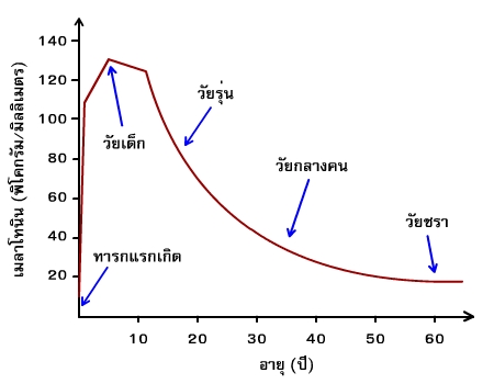 1ปีและจะสูงในระดับนี้จนอายุประมาณ 5-6 ปีหลังจากนั้นจะลดต่ำลง โดยเฉพาะในวัยรุ่นเมลาโทนินจะลดลงมาก เมื่ออายุ