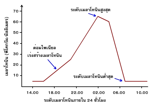 24 ชั่วโมง (circadian rhythm) ของคนวัยเจริญพันธุ์ ในเวลากลางคืนจะมีการสร้างเมลาโทนินมาก