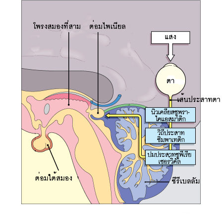 ตำแหน่งของต่อมไพเนียลและเส้นทางของสัญญาณประสาทจากตาสู่ต่อมไพเนียล
