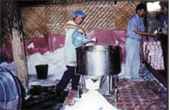 | การผลิตเกลือเสริมไอโอดีน คือ การนำเอาเกลือสินเธาว์ หรือเกลือทะเล มาเติมสารละลายโปแตสเซียมไอโอไดด์ หรือสารละลายโปแตสเซียมไอโอเดท สำหรับในประเทศไทยและประเทศที่กำลังพัฒนามีอากาศร้อนชื้น จึงใช้สารละลายโปแตสเซียมไอโอเดทเติมลงไปในเกลือ ซึ่งจะเติมให้มีสัดส่วนของไอโอดีน 50 ส่วนต่อเกลือ 1 ล้านส่วน (50 ppm) |